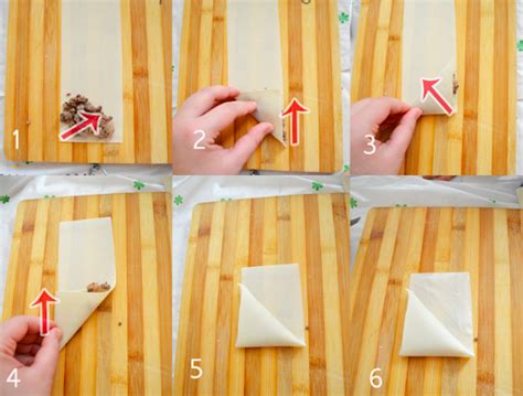 - Letakkan satu sendok makan isian di tengah adonan, lalu lipat kedua ujung adonan sehingga berbentuk segitiga.